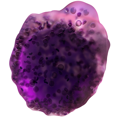This image depicts a chronic myeloid leukemia stem cell. The transformed myeloid stem cell is associated with the disease Chronic Myeloid Leukemia (CML). CML is a cancer of the myeloid cells caused by a genetic change in the stem cells, allowing the release of many partially mature cells. These cells accumulate in the bone marrow and prevent the production of other healthy blood cells, such as red blood cells, platelets, and white blood cells. Although affected cells are partially mature, they generally cannot perform immune functions as well as mature cells.