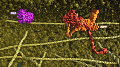 The animation depicts the signaling pathway of the protein Ras. The “Ras” protein (purple) is a small GTPase, that is activated when guanosine triphosphate is phosphorylated, which in turn leads to the activation of downstream pathways that play an important role in cellular differentiation, proliferation, and motility.