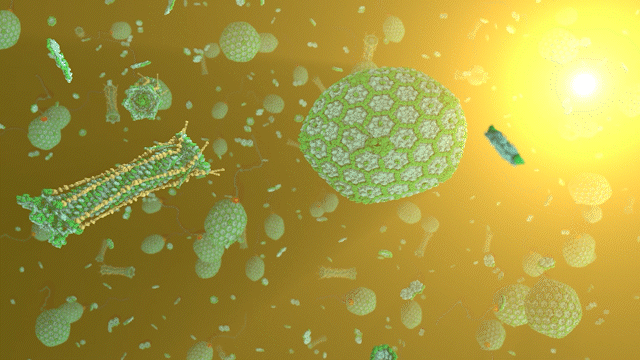 The video illustrates the T4 phage assembly in an infected E. coli bacterium. The DNA-loaded head is assembled into the sheath of the virus as it enters its last steps of assembly.